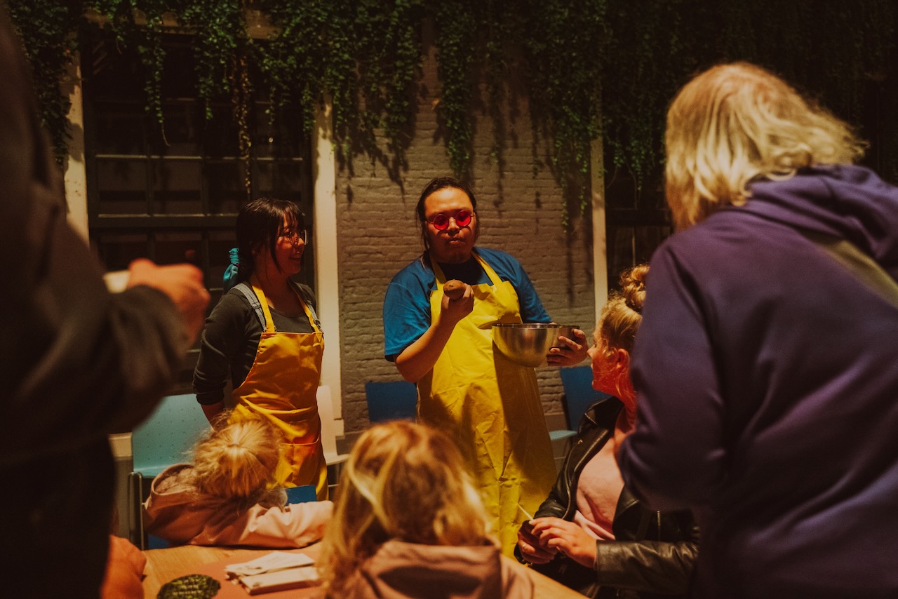 After settling on an isolated plot of land in Bierum, two fictional East Asian farmers venture to the local farmers’ market with a few new friends. Together, they set up a stand where they prepare one of Taiwan’s most beloved foods: 芋圓 (taro balls). The audience receives a serving in return for sharing stories, practical tips, or other local knowledge about Frisian farming. Traditionally made with taro, sweet potato, and tapioca starch, tonight’s recipe has been reimagined using Dutch ingredients and takes inspiration from Italian gnocchi. Guests are also warmly invited to join the food preparation and the conversations.